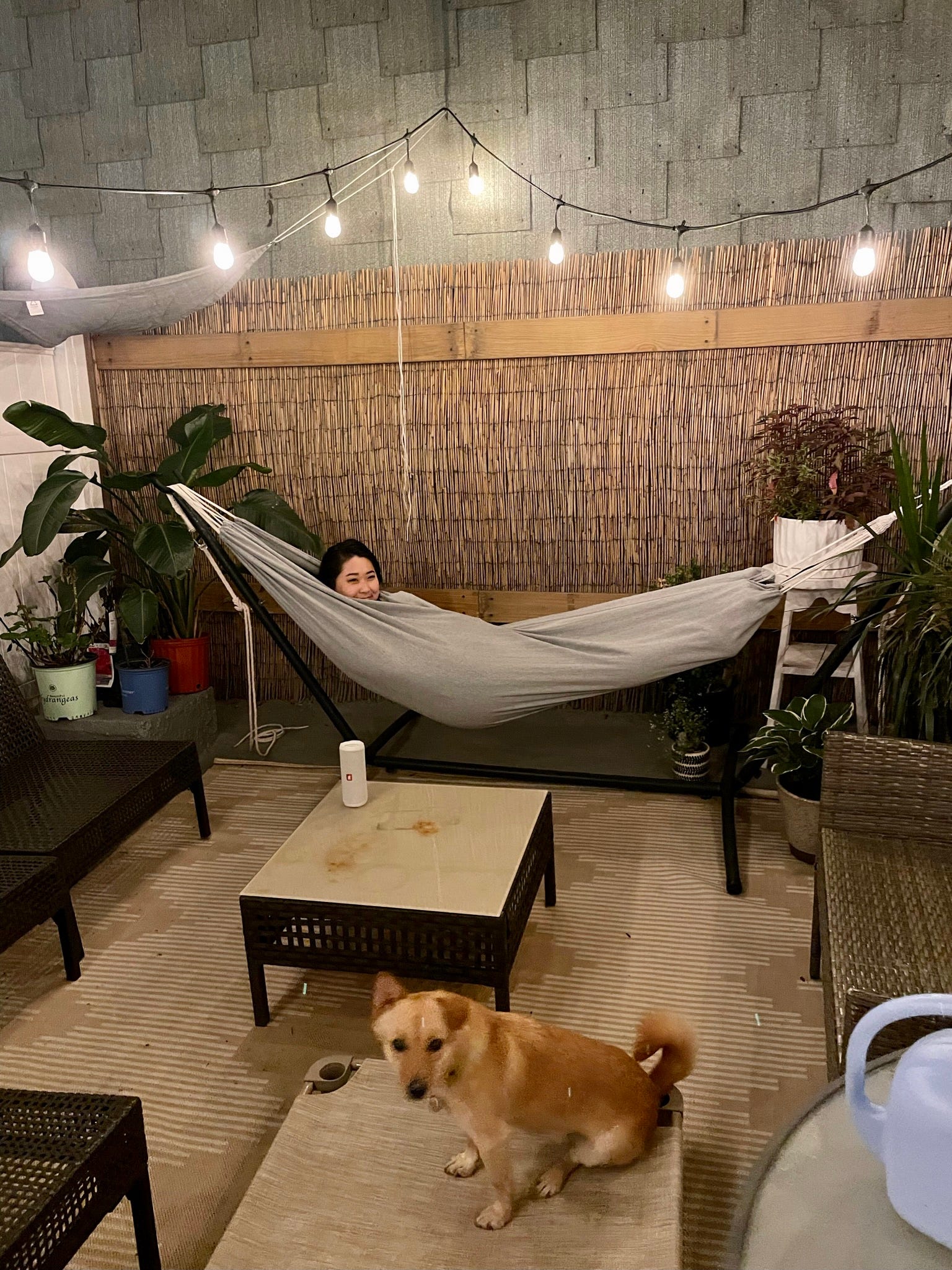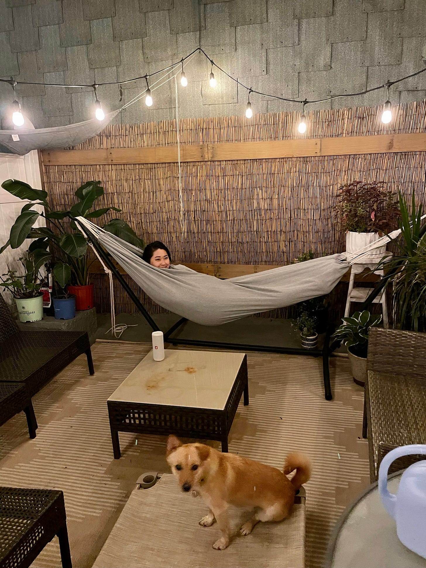 Is it really a newsletter from me if there’s not a single derpy pic in it? Here’s a rare picture of Buko and a not-so-rare picture of me being horizontal. Also, can we take a moment to appreciate Kristine’s beautiful Brooklyn backyard oasis?