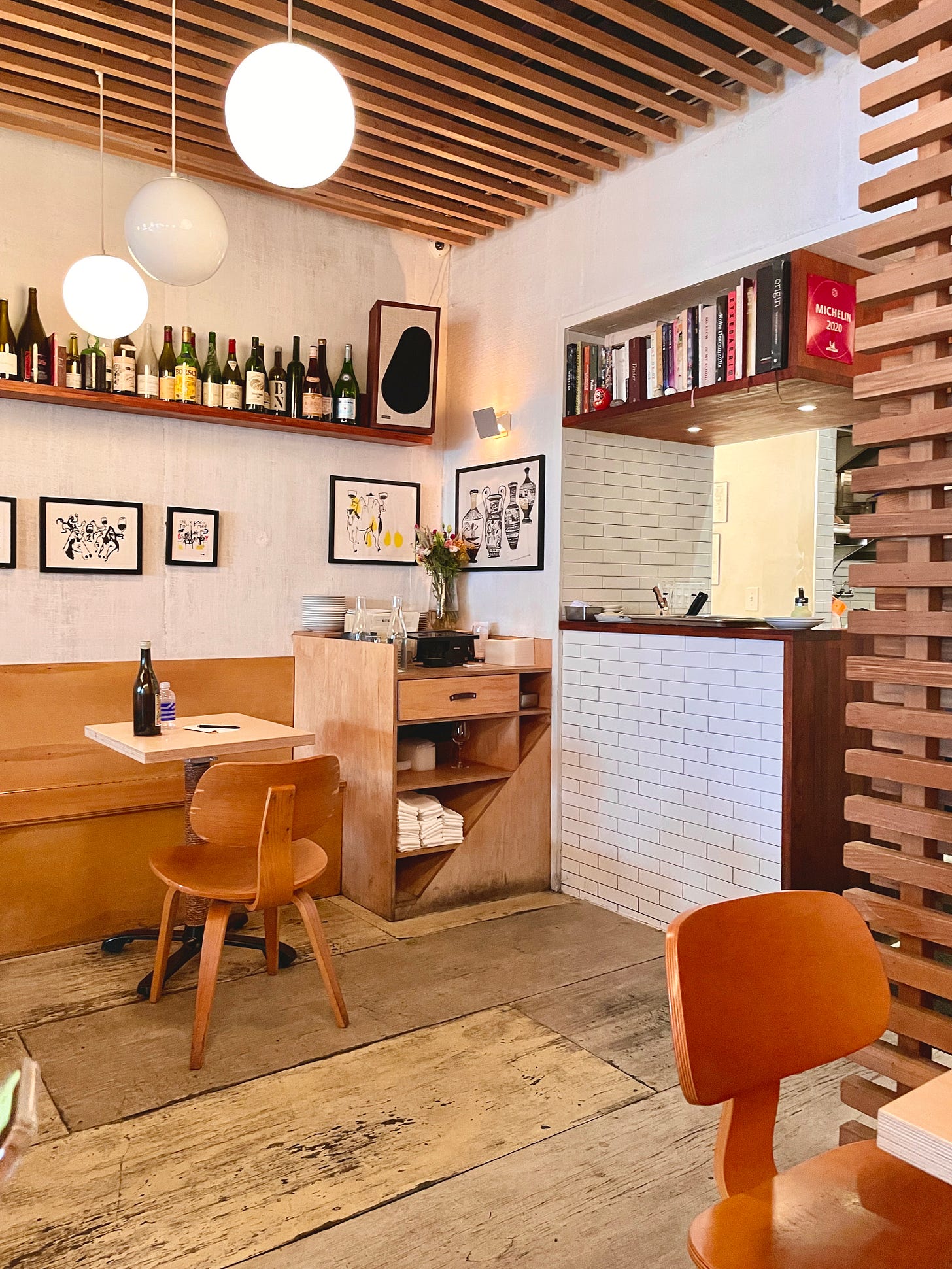 We arrived for our late afternoon reservation at the restaurant, where customers were still sitting and sipping at every table. I marveled at the beautiful millwork, the unique retro speakers, the awesome playlist, the artwork on the walls... of course, the food and wine were great too, selected from an ever-rotating daily menu of wines and tapas. It was even evident that all the waiters were good friends of each other, but there was no one disparate feature that made the restaurant special. Rather, the overall experience was imbued with so many touches of thoughtfulness—it was the particular melange of the individual elements that made the restaurant feel like a place where you wanted to just sit and hang out.